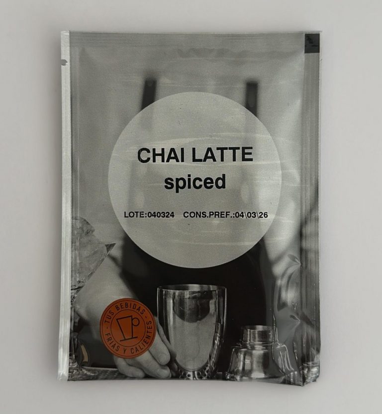 Azúcar, dextrosa, leche descremada en polvo 12% aromas, extracto de té negro 3% espesante: E412, especias 1,4% [cardamomo, clavo, canela, pimienta negra, jengibre), proteína de la leche, antiagiomerante: E551. Puede contener trazas de frutos secos y soja.